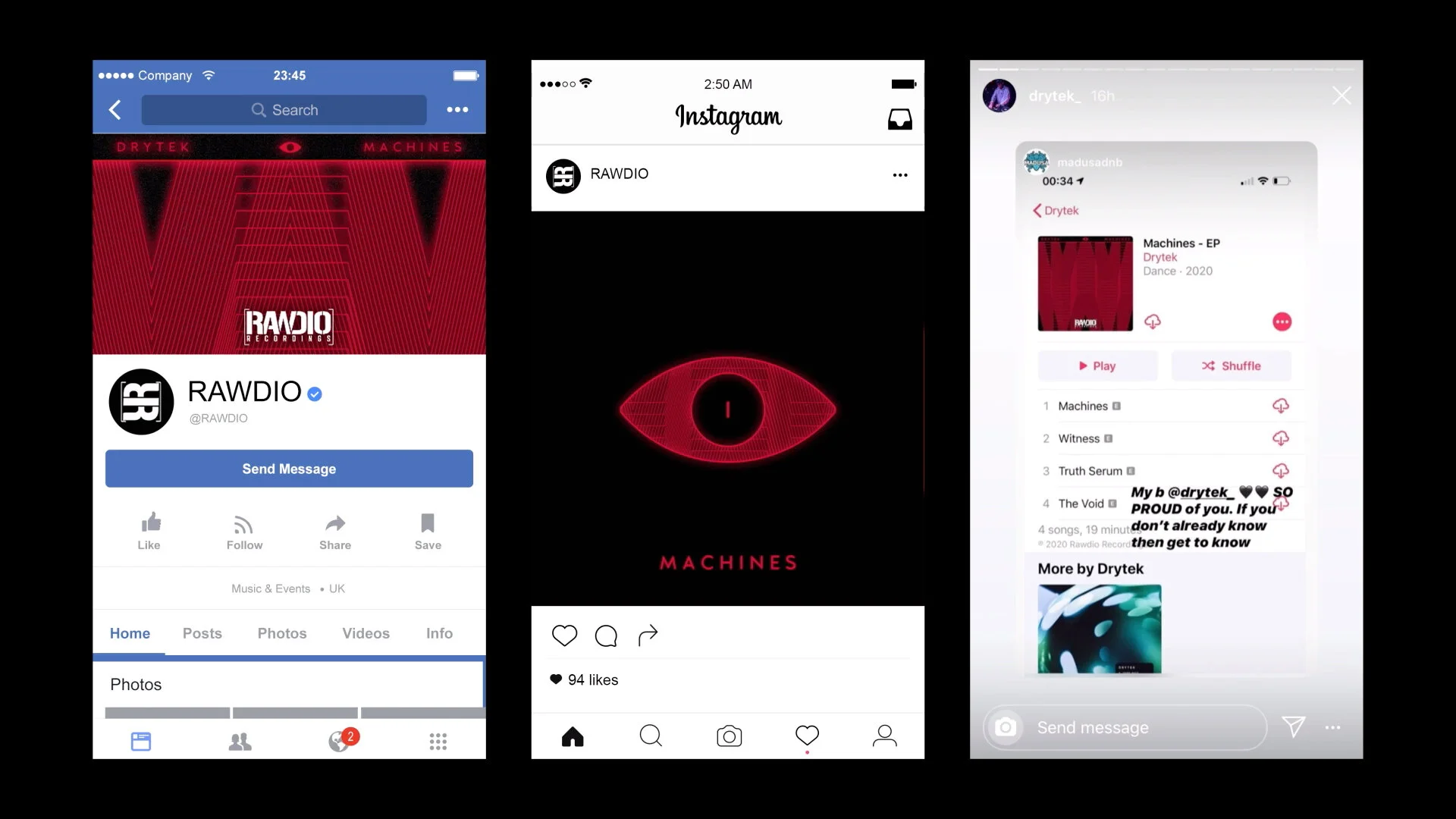 Artwork and promotional content for Rawdio Recordings first two EP releases, Drytek - Machines, Faeon - Submarine & Dysfunction - Warrior Charge. (Social Creative for Faeon & Dysfunction coming soon)
